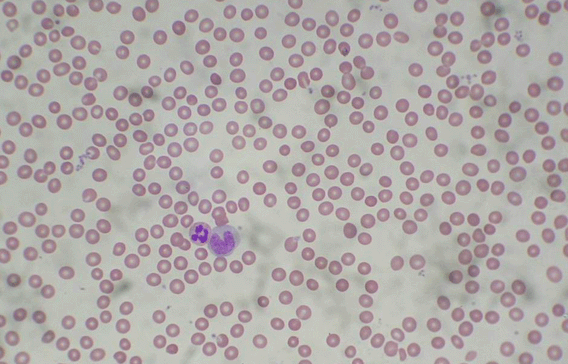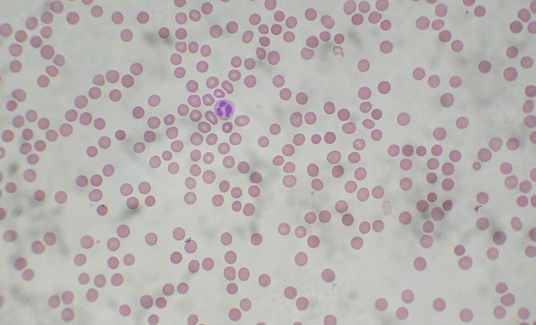 淋巴細(xì)胞:可觀察到中、小型兩種。小淋巴細(xì)胞與紅細(xì)胞大小相似,圓形,核致密,染成深紫色。周圍僅一薄層嗜堿性染成淡藍(lán)的細(xì)胞質(zhì)。中淋巴細(xì)胞較大,核圓形。直徑6-8微米。